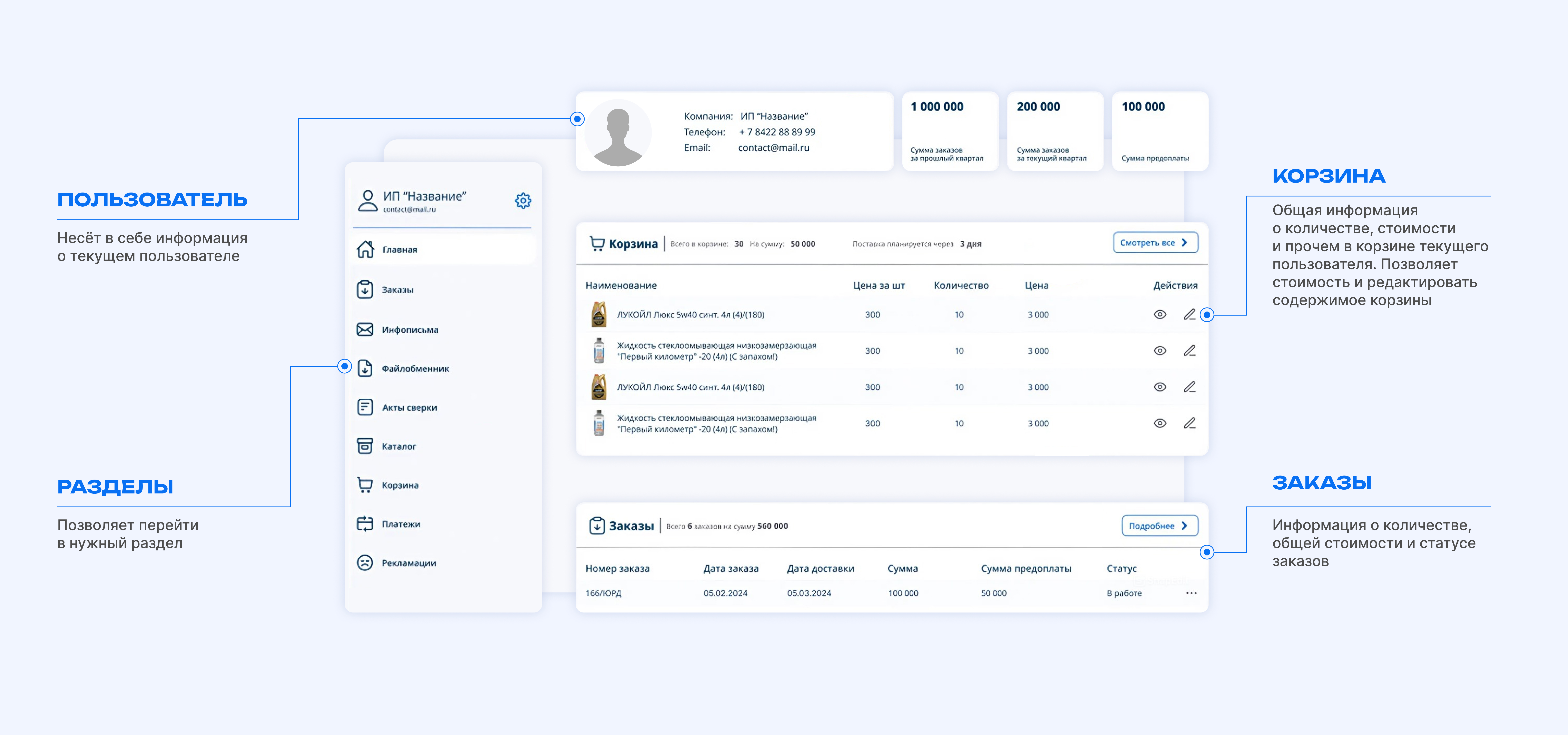 Реквизиты, контакты и товары с остатками.